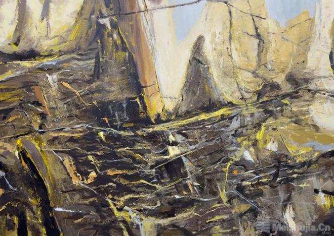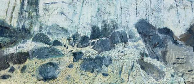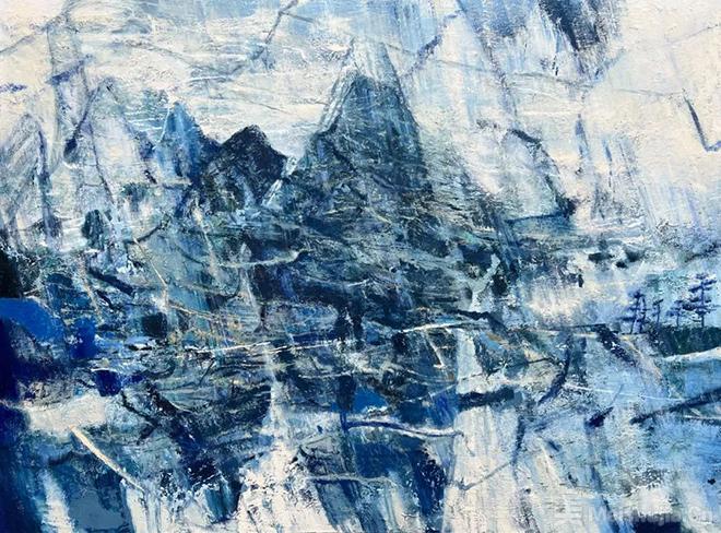 2016年,蓝威的“西部行旅”突破了他南方审美视野的局限,让他沉湎于西北大山大水粗粝坚硬、辽阔壮烈的风景描绘,他也在这种描绘中体味了不曾有过的激越崇高情怀。他不再陶醉于田园牧歌的诗意营造,而是力求从物质世界出发并延展到非具象的精神心理呈现。空寂遥远的大风景开始成为他精神表达的语言符号,一种由色料与画布肌理相互交织出的媒介质感成为画面精神表现的重要元素,仿佛让人们能够通过触觉来体味西北大风景所承载的边塞荒寒与戈壁荒漠。他的画面正中总画出突兀的山体以及乱云飞渡的意象,乱云与野水、疾风与骤雨不断制造出其繁乱的画面,其间,具象的山体不断被从天而降的斜线切割,使深远空间变奏为色块交错的平面结构。