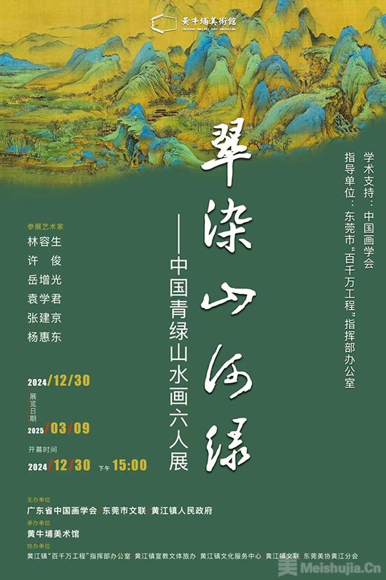 “翠染山河绿——中国青绿山水画六人展”将于2024年12月30日在黄江镇黄牛埔美术馆开展,展览持续至2025年3月9日。此次展览由黄江镇人民政府联合广东省中国画学会、东莞市文联主办。旨在响应《广东省国民经济和社会发展第十四个五年规划和2035年远景目标纲要》,深入践行绿水青山就是金山银山的理念,让广大群众更加深刻地认识到自然之美对于人类社会的重要价值,推动黄江镇文化艺术品牌建设,促进东莞市文化艺术事业繁荣发展。