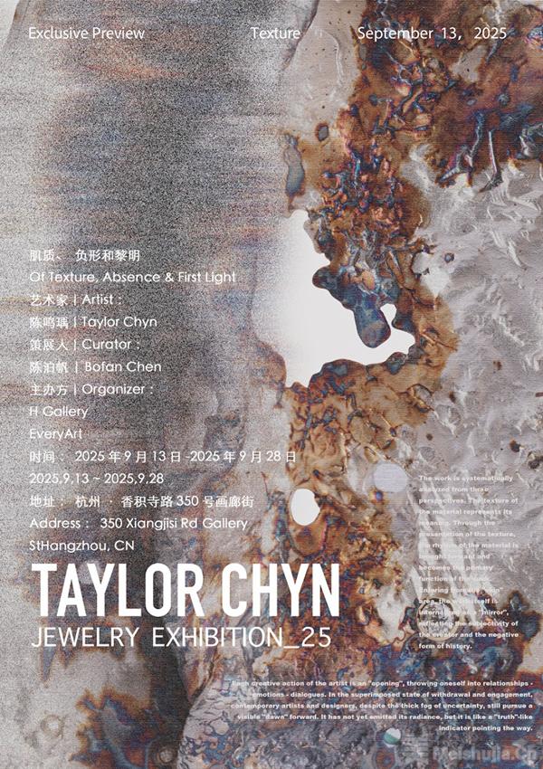 H Gallery、EveryArt荣幸联合呈献当代艺术家陈鸣瑀(Taylor Chyn)在H Gallery杭州空间的首展“肌质、负形和黎明”(Of Texture, Absence & First Light)。本次展览由陈泊帆担任策展人,将展出艺术家近年创作的多组当代首饰系列作品及绘画新作。此次展览作为Taylor Chyn在国内巡展的首站,将于2025年9月13日正式亮相杭州,并将于10月上旬登陆H Gallery上海空间。