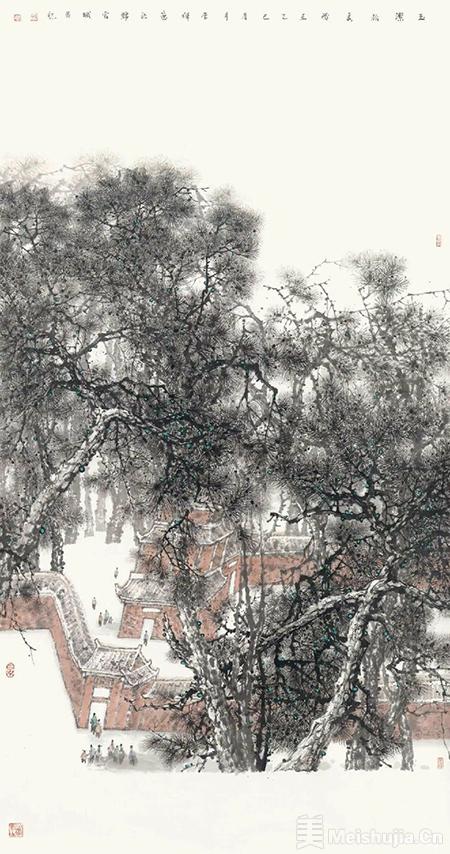 九寨,是李晖最知名的主题,他笔下的九寨,非复写实之景,亦非程式化山水之摹。他以“硬笔柔色”为刃,剖开了西部山水的雄浑肌理——干笔钉头如小锤千敲,塑出山峦的骨骼;一湾碧水似祖母绿,嵌入了高原的灵韵。“上善若水”的东方哲思,在《倒影水晶》的波光中、在《九寨初雪》的雪色里,化作了可触可感的绘画语言。这套于九寨山水中所形成的、独属于李晖的笔墨体系,并非是对传统山水的延续,而是为九寨这一本就从未见诸传统画作中的主题,寻到的全新的表现路径。所以,九寨成就了李晖,李晖也回馈给了九寨一整套的笔法墨韵。