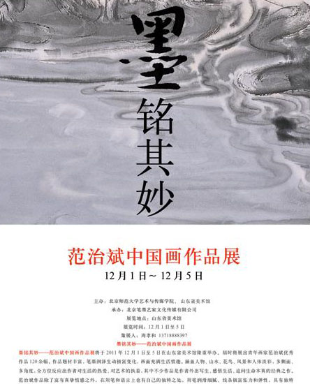 墨铭其妙——范治斌中国画作品展将于2011年12月1日至5日在山东省美术馆隆重举办。届时将展出青年画家范治斌优秀作品120余幅。作品题材丰富,笔墨润泽生动极富变化,画面充满生活情趣。涵盖人物、山水、花鸟、风景和人体淡彩,多侧面、多角度,全方位反应出作者对生活的热爱、对艺术的执着,其中不少作品是作者外出写生、感悟生活、追问生命本真的经典之作。范治斌作品除了富有真挚情感之外,在用笔和语言上也有自己的独特之处,用笔润滑细腻、线条极富张力和弹性,具有独特的表现手法和鲜明的中国画语言,愿此次范治斌中国画作品展给热爱艺术的人们带来全新的视觉体验和精神愉悦。