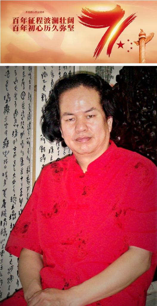 这件创作于2001年的252×96cm的大型扇作——《金石造像颂邓公》的作品中,不仅那13方‘朱红色巨印’及13块‘深红色(注:传统为黑色)边款’乃是刀凿而成,就连邓小平同志的画像(注:小平同志‘面部’那饱经沧桑的‘质感’都表现的……)以及苍劲古老的松柏、雄伟的万里长城,还有深圳、香港等‘大型画面’也都是在‘巨大印石’上刀凿而成,然后再用他那——‘行派’独创之‘技法’再现于‘画面上’的“金石造像画”(行斌先生独造的“金石造像画”,分为‘西洋具像式’‘和‘中国汉画像式’两种风格。该作即典型的: