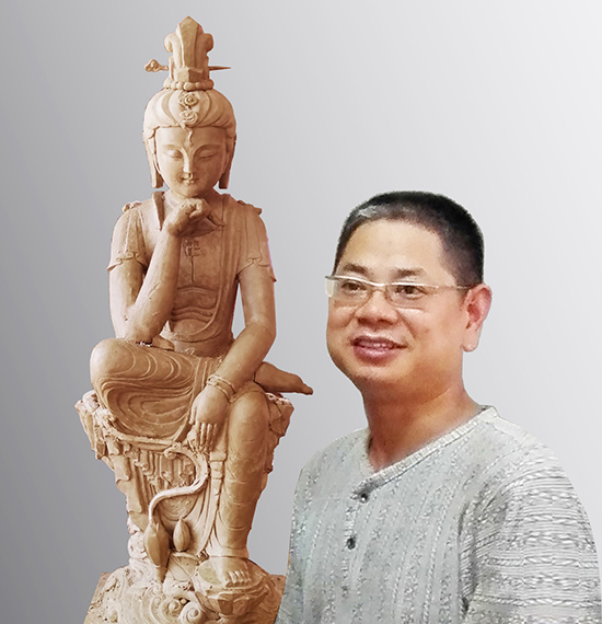 半跏思惟菩萨像是中国北朝晚期佛教造像中颇为流行的菩萨样式,早于法国罗丹1880年作品“思想者”近一千四百多年,是东方千百万思想者的化身。思惟菩萨像姿势特殊,一般以左足垂地,右脚横置于左膝,上身稍前倾,曲右肘支颐,以一指或数指微触面颊,左手平放在翘起右脚之上,呈现思惟之状。以悉达多太子思惟像、弥勒思惟像等较著名。本尊思惟菩萨创作选取悉达多太子为创作主体,表达太子在成佛之前为救渡红尘众生诸多苦难的冥想与思考。塑像以载道,期以成像存世化度有缘众生。