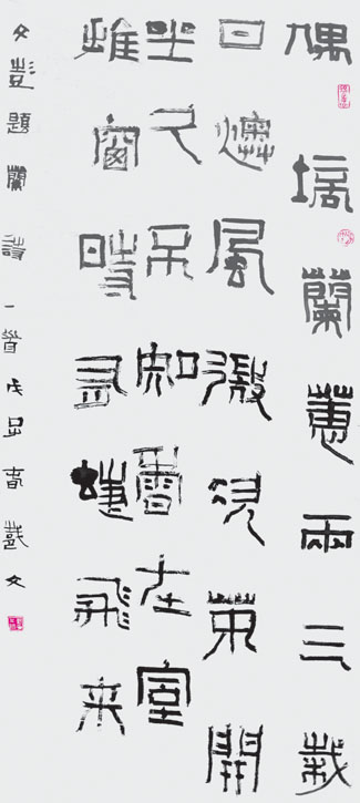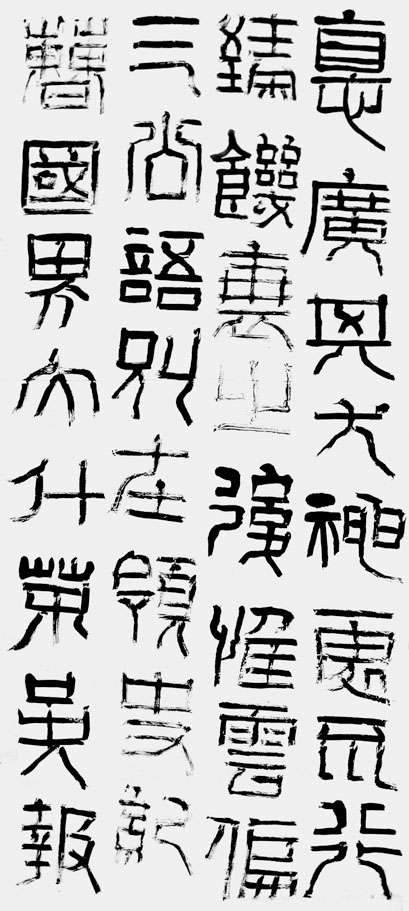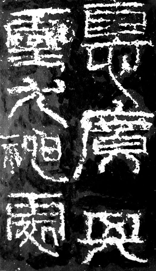 《祀三公山碑》以方笔写篆书,开篆法用笔新境界。历来作篆皆尚中锋圆笔,求其浑雄婉通;作隶用方笔,取其峻利茂密。《祀三公山碑》起笔方截,尤显古拙生辣。转折处方圆兼用,小者用圆,大者用方,别开生面地展现了一种生涩峭厉的篆书体例。与用方重之笔相吻合的是,《祀三公山碑》在结字上一改篆书纵向延伸、修长的特征,易之以方折、紧敛的结字方法。这种以方为体的篆书结字形式,具有很强的视觉冲击力,显得宽绰雄强、稳重方博,呈现出一种宽宏浩大的气象,集合了瓦当文字与汉印文字的装饰之美。不同的是,瓦当文字与汉印文字是少数字派,而《祀三公山碑》则是一篇缜密绵长的文字巨作。字形虽方整,收笔处往往左右分开,造成横向开张之势,通过对弧形圆线的巧妙运用,将“蜾扁与缪篆相糅合”,浑穆中更显灵巧生动,让人觉得在方整的结体中仍荡漾着勃勃生机。