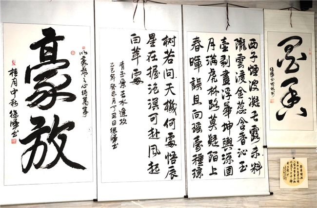 而本次杭州站展览,全场背景音乐均由其创立的杭州墨刀文化传播有限公司提供,均为原创歌曲,音乐与书法作品意境相融,营造“视听一体”的沉浸式艺术场域,实现“耳闻仙乐,目染墨香”的独特观展体验。
