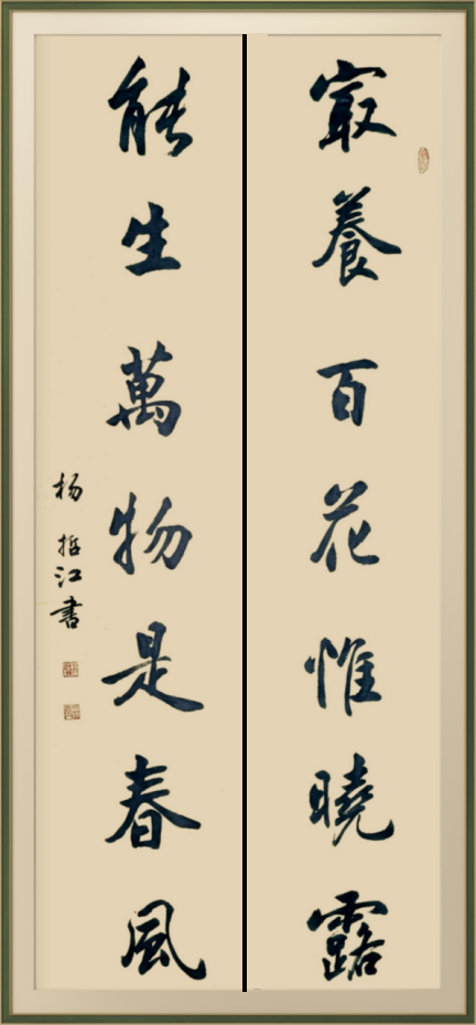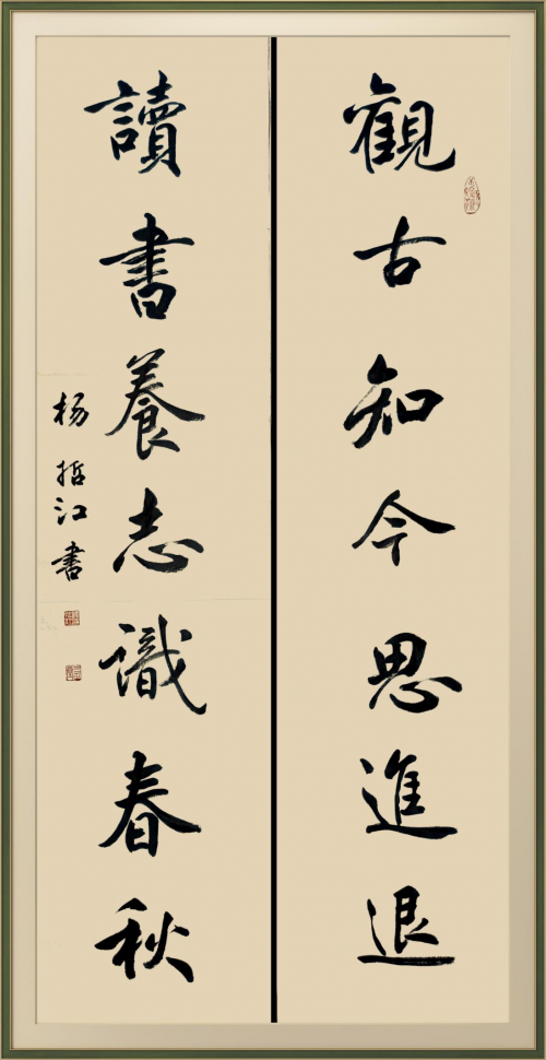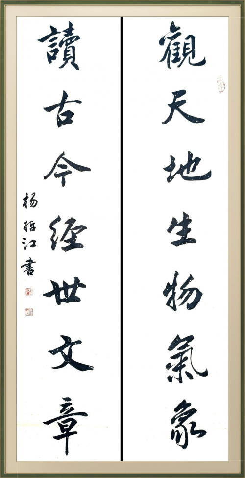 杨哲江幼承庭训,随父学书。先临欧、颜、柳,又学赵、米、王,并得到著名书法家欧阳中石,旭宇、邹德忠、卢中南等前辈的指教。中石先生对其作品的评价是:作品很美,布局严谨,笔法流畅,书卷气很浓,欣赏其作品有种美的享受。建议要在不失传统的情况下注重创新,并坚持发扬自己的风格。