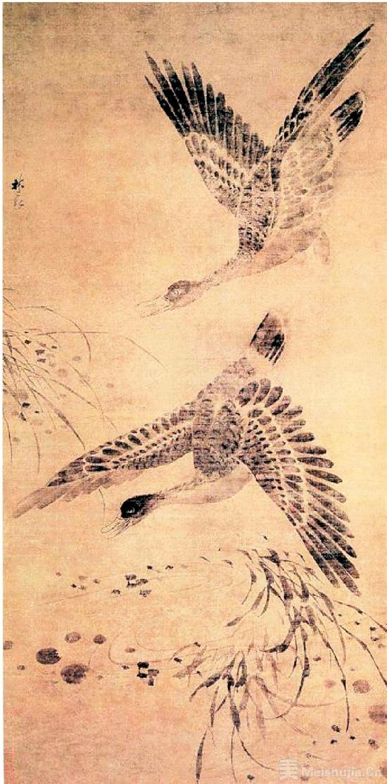 如左下图所示,这件宣德青花碗残件,撇除从胎骨、釉水、底足、款识辨别,一对野塘中的芦雁,仅从“横向联系”——对照明宣德水墨写意画派开创者林良的芦雁,造型、用笔等,你就能判断,庶几“同时代一体”。加之青花淡雅的发色、很“奶”的釉面、底足上“大明宣德年制”书写的特点,能确定为明朝宣德本朝制品无疑。此残件底足上有“大明宣德年制”落款,目前民间所见的底足“大明宣德年制”瓷器,绝大多数是清朝康雍乾年间的制品,属寄托款。