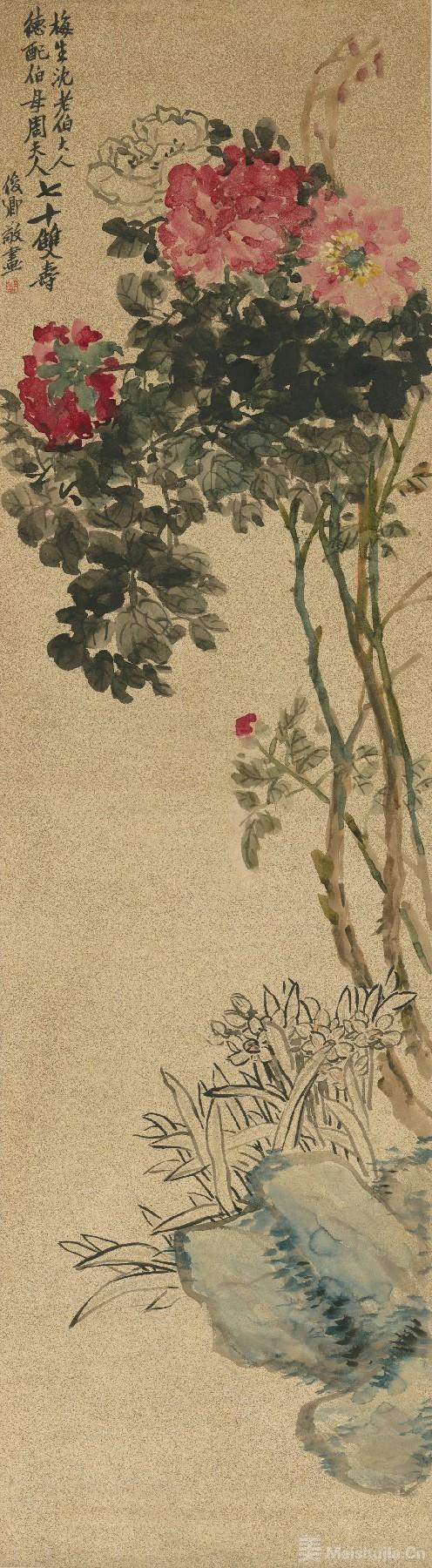 至近代,吴昌硕以金石篆籀之笔入画,牡丹枝干如铁,花瓣浑厚,设色浓烈如朱砂点染,形成“重、拙、大”的金石气象。其《牡丹图》中,红黑对比强烈,枝叶如篆书笔意盘曲,将牡丹的富贵升华为雄浑苍劲的生命力。这种充满金石味的生命气象,实为海派商业文化与传统文人趣味的奇妙融合。齐白石更进一步,借鉴民间年画的对比手法,以墨叶衬托红花,创造出“红花墨叶”的程式语言。其以湿笔晕染表现雨后牡丹花叶的下垂之态,墨色氤氲中透出清新野趣,并常题“大富贵亦寿考”,将牡丹的象征意义世俗化,融入民间对平安吉祥的朴素祈愿,反映了近代中国审美从文人雅趣向市井烟火味的过渡。可以说,牡丹既有“国色天香”之冠冕,也扎根于菜畦篱笆之间,花瓣上沾着晶莹的露水,根脉扎在泥土的深处,拥有生生不息的力量。花入画,不只在其形,更在其神,牡丹的富贵或野逸,主要在于创作者和欣赏者的觉知。