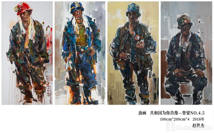 从题材选择上看,石油出身的赵世杰循着工业题材的创作主线,在一次采风中将视角延伸到抚顺矿务集团的矿工群体。他深深地被矿工们朴实敦厚、顶天立地、艰苦奉献的精神气概所震撼折服,灵感迸发、思如泉涌,决定在画布上用浓墨重彩为共和国的“脊梁”肖像。为了不影响矿工的正常生产和返家,赵世杰现场泼墨作画、挥汗如雨,4幅2米高、1米宽的大型油画均是一气呵成,每幅画仅用不到4个小时,展现了赵世杰对绘画语言、风格、情感、手法、技巧、造型和色彩的高超的把控能力。在辽河油田长期一线工作经历,让他更容易与深入工业生产一线劳动者打成一片。从矿工们一开始的抵触,到最后被真诚而震撼的作品而感动,赵世杰成功走进产业工人的真实生活与精神世界,展现了艺术作品的强大魅力。他深知这些产业工人在国家建设中所付出的艰辛与贡献,因此选择以他们为描绘对象,是对其自身石油行业经历的一种艺术化回顾与致敬。