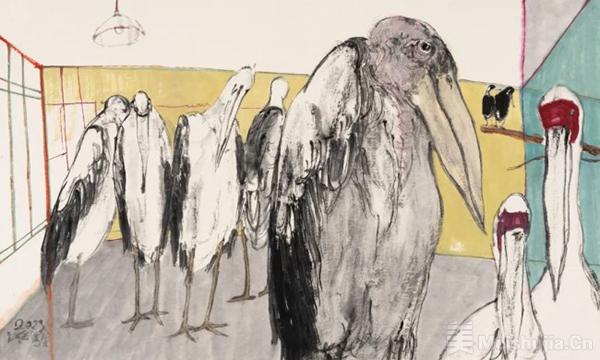 如今创作,我总将生活感触、时代理解、当下审美与文化语境融入画面,正源于此。朱耷为我打开思路,即万物皆可入画。如我的作品《混淆的时间——痕迹》中绘有一张纯金唱片,这一意象源于20世纪70年代人类向太空发射的探测器NASA1号,这张金色的唱片搭载着地球文明的声音飞向太空,这些记忆和它播放的乐曲都被我纳入画中。画面中显得非常突出的鹳鸟,以“拟人化”的特征出现。这种“拟人化”,不是刻意为之,而是希望今天的花鸟画作品跳出古意的框框。其实朱耷笔下的鸟亦饱含情感,所谓的“冷眼看世界”,或许正是他赋予生命更强烈的活力与情感的方式。