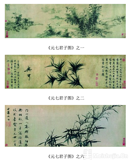 一件流传有序的书画作品,其实是一段历史和文化的见证,从书画收藏角度来说更具价值。《元七君子图》曾被多位收藏家珍藏,历经改装,流传经历相当曲折。康熙年间,缪曰藻在《寓意录》有记载“竹林七友,俱纸本”,可知《元七君子图》原名“竹林七友”,收裱了元朝赵天裕等五位画家的七件墨竹作品。道光年间,徐渭仁辑校的《寓意录》版本中记载稍有增加,表明徐守和或许是最早藏家,是他陆续收集了这五位元人的七幅墨竹,将它们装裱成卷,题为“竹林七友”,造就了这么一件流传于世的绘画精品。
