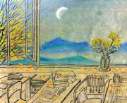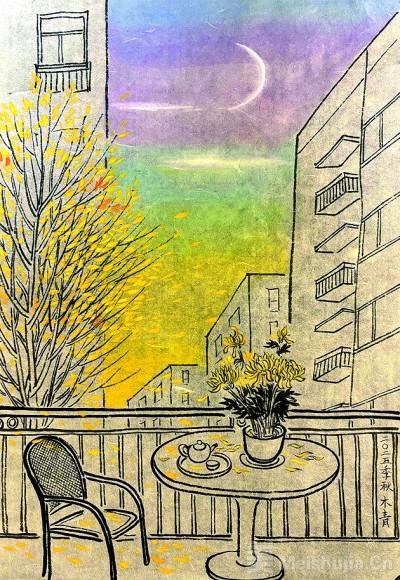 最后还有一幅教室的画境,这是我画给女儿的“密信”。读初中以来,女儿大部分时间都埋在作业堆里,重重的标准牵动着她的心。青少年需要练习扛压,不断自我突破,可我也希望她在这青春的年龄中,枝枝叶叶都能舒展。所以,在画里我给教室开了一扇大大的窗,窗外碧空如洗,细月能听懂她的心弦,风把秋叶送到她的课桌上、书籍上、试卷上,我期待她能在埋头学习的间隙,遇见远处朦胧的山影,悠然欣赏,体验每一个生命瞬间。