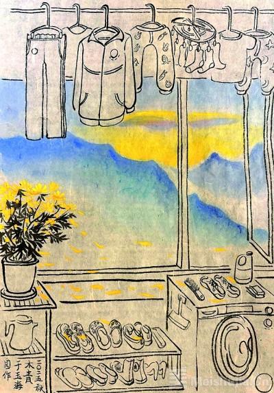 另一幅,是我作为母亲的“心远”瞬间。每天照顾一双子女的衣食住行,日常生活填满了零碎的片段。某日洗衣晾晒时,当我把校服、秋衣、袜子一一挂好,悠然见到窗外秋山寂静、晚霞浪漫。这当然并非实情,我没有这样一扇“诗意”的窗景,可这心境却又真实无比,每一位母亲都曾想能在时间的缝隙里,遇见那个更超脱的自己。