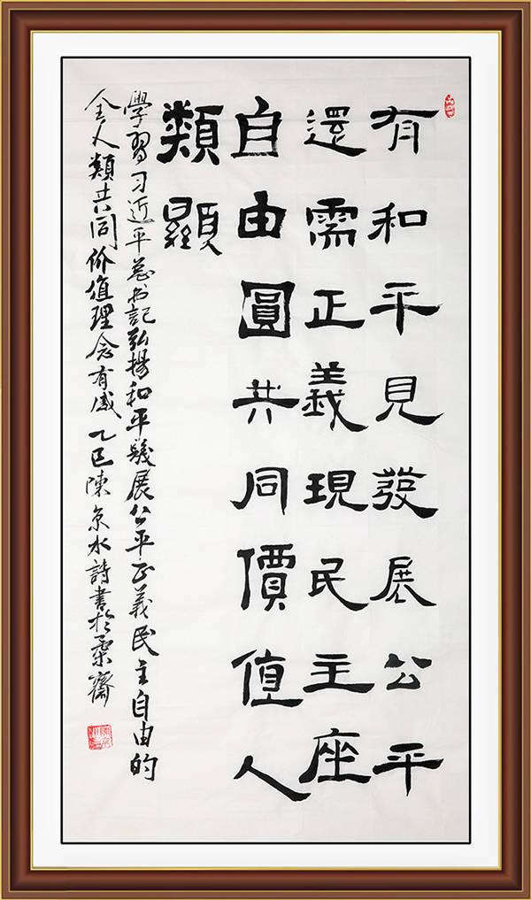 2025年8月为纪念抗日战争胜利80 周年暨世界反法西斯战争胜利80周年活动中,《圣德在天龙 贤道复兴梦》一副作品作为国礼赠送26个国家元首和其他国家。爱国主义教育学刊编委会授予“艺术中国心,中国艺术将领”荣誉称号。