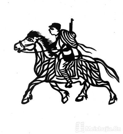 版画家力群与晋西北农村妇女牛桂英合作而成的《八路军骑马》,用剪纸手法表现了骑马的八路军形象,力群创作了轮廓,里面的形象则由牛桂英剪成。画面刻画生动简洁,八路军战士躬身驾马,肩背步枪,身挎背包,背带草帽,看形象应该是穿插于前线与后方的通信兵,这是在抗战时期常见的八路军战士形象。作者根据对生活的敏锐观察,准确地抓住了八路军骑马形态与动作,画面之中利用剪纸线条飘动的走向,呈现出人物疾驰的动感。这幅由版画家和农民合作的作品充分体现了延安美术家向群众学习的虚心态度。