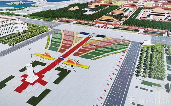 自高空俯瞰天安门广场,天安门城楼、长安街、广场观礼台、年号台、人民英雄纪念碑自北向南依次排列。80面红旗分列广场两侧。国旗杆到纪念碑铺陈16米宽的红毯。红毯两侧的观礼台布局呈现出三个“人”字,构成一个意象化的“众”字。广场坐席的通道走向都指向人民英雄纪念碑,是一种致敬先烈的设计构想。谈到这一构想,中央美术学院建筑学院教授钟山风介绍:“此次设计方案选择‘三人成众’的基本格局。为此我们建了全部坐席的模型,做了全仿真的模拟,坡度大概在15度到20度之间逐渐变化,保证观众在观礼台上有舒适的就坐空间,且能够看到整个阅兵队伍。观礼台还使用了专属色彩,呈现出大国气象。”
