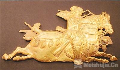 吐蕃骑射武士形饰牌造型威武,动感十足,格外引人注目。骑者缠头巾,头巾下方两条发辫随风飞舞,双目圆瞪,嘴下有浓密的络腮胡须;身穿紧身三角形大翻领长袍,双手拉弓欲射,腰部系带,其上垂挂箭囊,腰后露出刀柄。马尾打有结扣,杏叶凌空飞动,气势撼人。金饰牌背面残存带黑漆皮的薄木片,上面有金钉将饰牌与木片定缀在一起,可知此饰牌原来应为某件木质器皿上的装饰物。“这件饰牌的造型受到西亚萨珊王朝金银器上的帝王狩猎图影响,而骑士的装束却是吐蕃风格,体现了文化的交融。”赵婧说,青海省都兰县热水墓群出土了相似的骑射形金饰片,亦为吐蕃时期的器物。