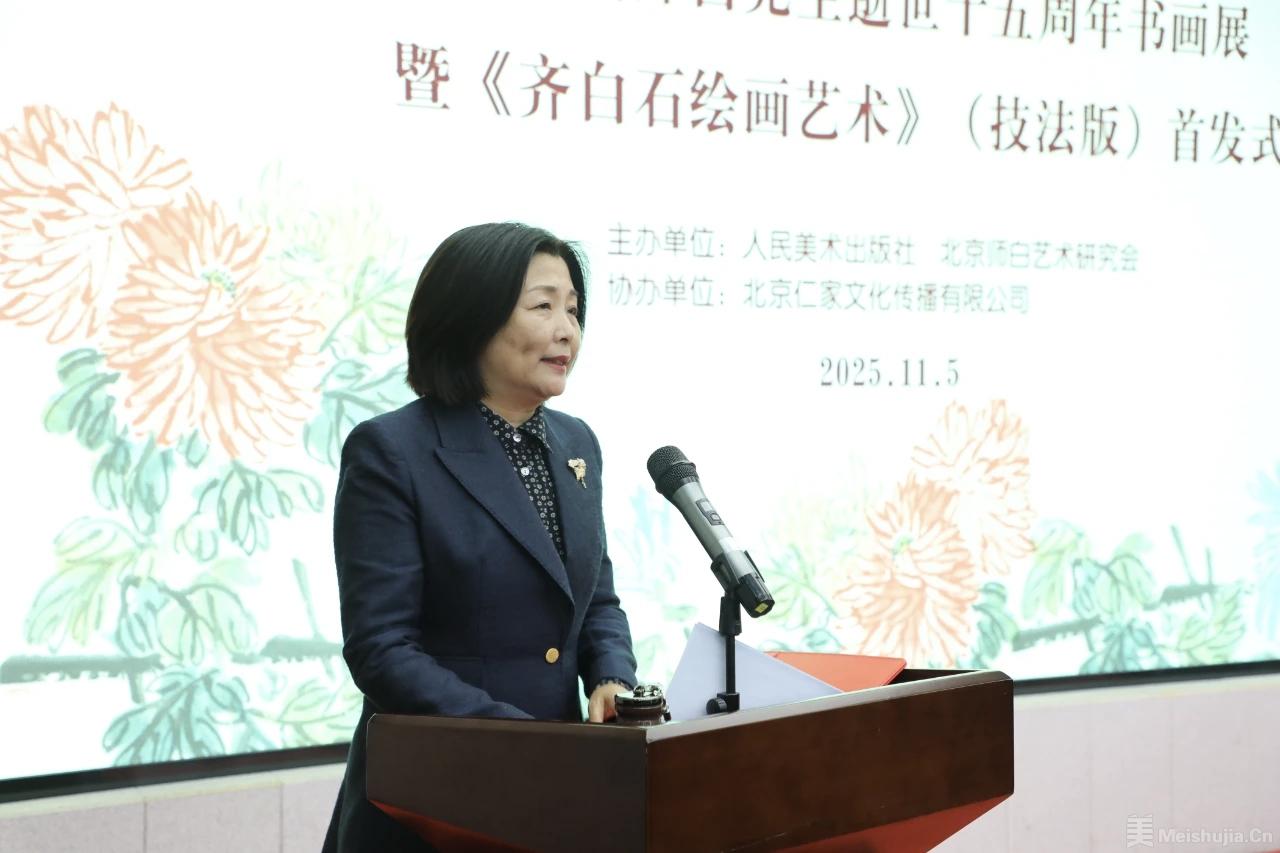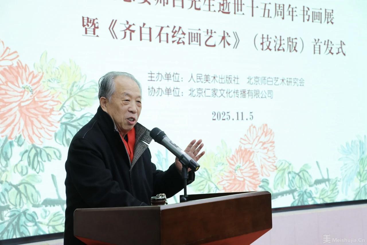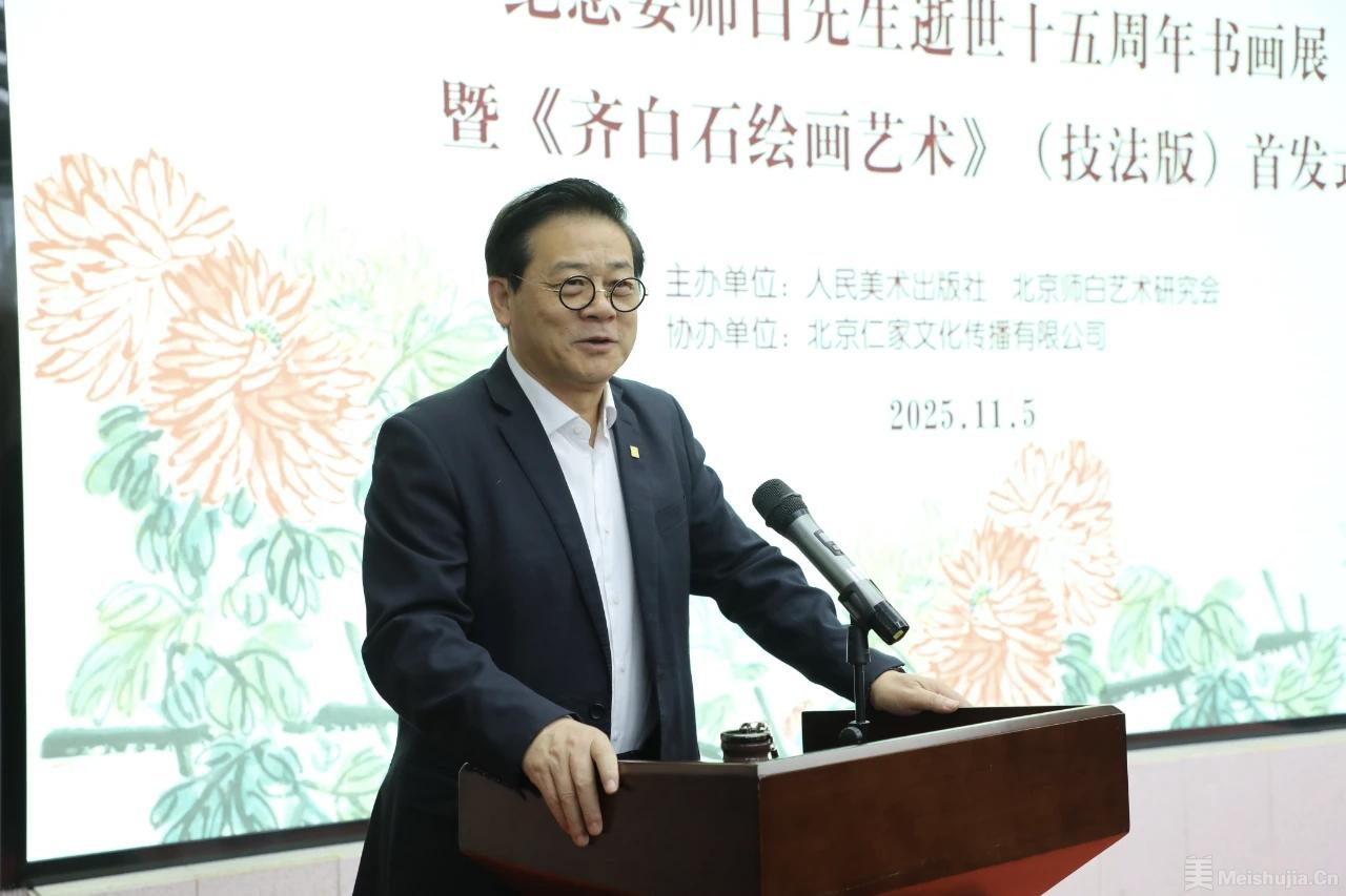 王远在致欢迎词中表示:人民美术出版社自成立以来,始终以“弘扬中华优秀传统文化、推动美术事业发展”为己任,深耕美术出版主业,从经典美术画册的编纂到美术理论著作的出版,从大众美术读物的普及到专业艺术教材的打造,始终坚守文化品质,推出了一大批兼具思想性、艺术性、观赏性的精品力作,成为连接美术创作者与普通大众的重要桥梁,成为传承中华优秀传统文化的重要力量。多年来,娄师白先生的家属与北京师白艺术研究会和人民美术出版社密切合作,携手传承齐派艺术、弘扬齐白石和娄师白艺术精髓。早在2004年,人美社就曾出版展现娄师白艺术成就的精装大画册,这是当时大众了解娄师白绘画艺术最直观的窗口;2023年,《齐白石绘画艺术》4册套装本的推出,引发热烈的社会反响,更作为国礼赠送俄罗斯国家图书馆,让齐派艺术与娄师白先生的艺术传承走出国门;2024年,在齐白石诞辰160周年、娄师白诞辰105周年之际,人美社推出《齐白石绘画艺术》(珍藏版),并举办高规格“人民艺术家齐白石绘画艺术特展”和学术研讨会,掀起了齐派艺术研究与传播的新高潮;今天,在2025年11月娄师白先生逝世15周年之际,《齐白石绘画艺术》(技法版)6册的重磅推出,更是以扎实的技法解析,深入践行了娄师白先生“誓把师传播五洲”的殷切夙愿。今天开幕的书画展是娄师白先生艺术成就的集中展示,每一件作品都凝结着他执着的艺术追求与对其恩师齐白石艺术的虔诚传承;《齐白石绘画艺术》(技法版)6册的发布,将齐派艺术实践与思考的精华、娄师白先生的传承智慧以更系统、更易懂的方式传递给后学,为中国书画艺术的技法研究与人才培养提供了宝贵资料。娄师白先生的艺术人生,始终秉持“守正”与“创新”。他坚守齐派艺术的精神内核,深入生活、提炼笔墨;又在题材拓展、技法表达上锐意创新,形成了独具个人风貌的艺术语言。他的艺术之路兼重“翰墨”与“精神”,以对艺术的赤诚,薪传齐派艺术技法,这是他作为一代艺术大家的坚守。文化是民族的精神命脉,出版是文化传承的重要载体。人美社十分重视与艺术家的合作共生关系,进入新时代,更是致力于建设出版、教育、创作、展览等跨媒体平台,通过更多有筋骨、有道德、有温度的文艺作品,展示当代中国艺术的精神和气象。