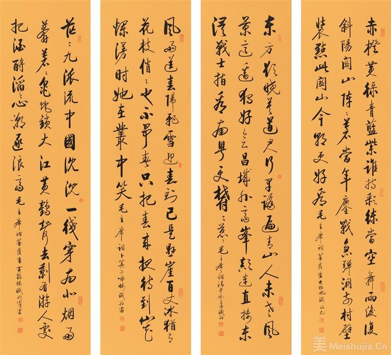 最喜先生《咏四季诗钞》四幅作品,巧妙地将四位不同时代诗人吟咏春夏秋冬的四首诗连缀一起。窃以为,四首诗是此书中创作最为生动畅达、翩然生姿的作品,通篇毫无拘谨生涩,在法度中尽抒胸臆,在点画线条中打开了最为精彩的艺术华章,思想之自由诉诸笔墨之自由,因而酣畅淋漓、趣味横生,犹如四季之画卷,为读者解读了春之生机、夏之热烈、秋之灿烂、冬之静纯,其内容与形式得到完美的统一融合。