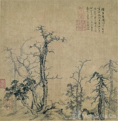 寒林山水兴于十至十一世纪,后被赋予丰富的文化内涵,发展为一种山水画程式。画中的平远山水、疏林枯槎等形象所展现出的萧散淡远、幽冷荒寒的美感,是画家超然心境的视觉表征,也成为中国画所追求的审美境界。