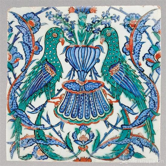 鹦鹉纹砖 土耳其 伊兹尼克 约1600年 釉陶 透明釉下化妆土上彩绘 高25.2厘米 宽24.8厘米