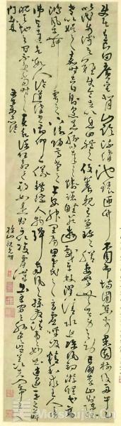 祝允明此书系抄录东汉仲长统《乐志论》。考正史中《后汉书》始立《隐逸传》,而《乐志论》即可视为传统文人第一篇正式的隐逸宣言,内容即表达文人超尘拔俗、高蹈远引之志。祝允明天资聪颖,性格豪爽,诗文书法均负盛名,其书法得外祖父徐有贞﹑岳父李应祯指授,又临仿前代,善于以意构之,以草书造诣最高。此轴即出入于张旭与怀素之间,用笔劲秀,墨法氤氲,文意与笔意相映发。