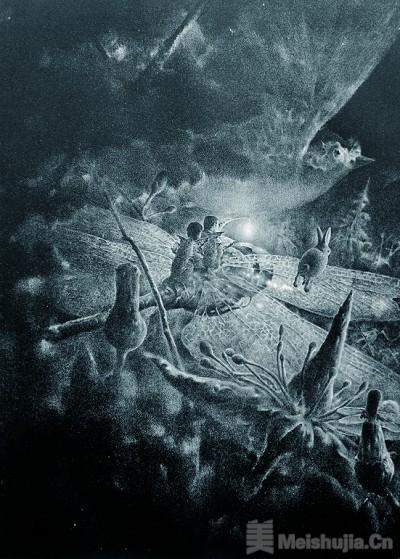 石版画《夜潜行》的创作正是以记忆中的那片树林为灵感,并融合了我的青春记忆与浪漫幻想。该作品以超现实的表现手法,描绘了一对恋人骑着蜻蜓座驾,与巨大的鸟儿、跳跃的野兔为伴,遨游于充满梦幻色彩的树林中。石版细腻的颗粒质感为画面带来朦胧的视觉感受,黑白灰的柔和过渡则为这林中奇景增添了几分神秘感。每每驻足画前,都让我想起一个青涩少年对未知远方的向往,以及身处暗夜仍努力寻光的倔强。这些美好而难忘的生命故事,皆是支撑我绘画创作的重要力量与不竭源泉。