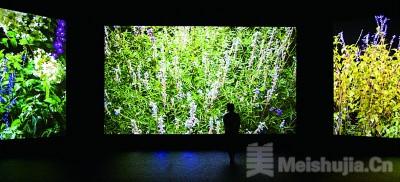 蓝紫、粉金、银灰、藻绿……站在意大利艺术家夸尤拉带来的《夏日花园》(图⑥)动态影像作品前,4K三联屏中的花花草草“随风而动”,一抹抹色彩忽而清晰忽而模糊,仿佛把人带入法国印象派画家莫奈的午后花园。作品借助一套庞大的技术装置,通过超高清摄像机与定制计算机软件,捕捉了人类主观视觉感受之外的机器之“眼”的观看景象。艺术家靳军的《描摹与共生——今日珍禽图》则采用交互科技多端同步,观众可亲手绘制属于自己的珍禽飞鸟,与名作中的群鸟相映成趣。