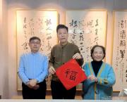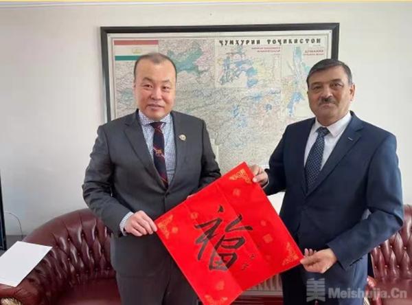 名人书法家金思宇书写的福字被赠送给塔吉克斯坦共和国驻华特命全权大使萨义德佐达·佐希尔先生(右)