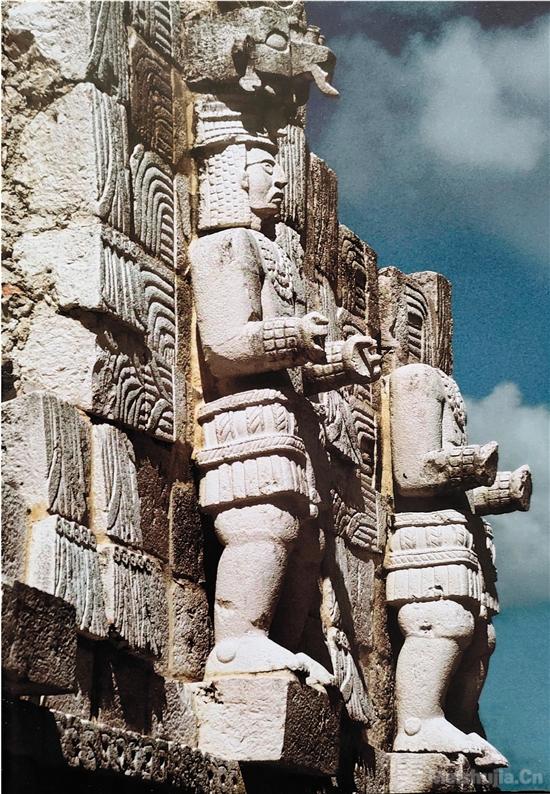卡巴一座神殿外墙上与浮雕共存的立体圆雕像。